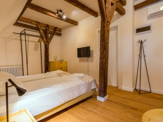 Camera double/twin este situata la mansarda si are 2 paturi single si baie proprie cu dus. Suprafata: 25 mp. Poate acomoda maxim 2 persoane.
